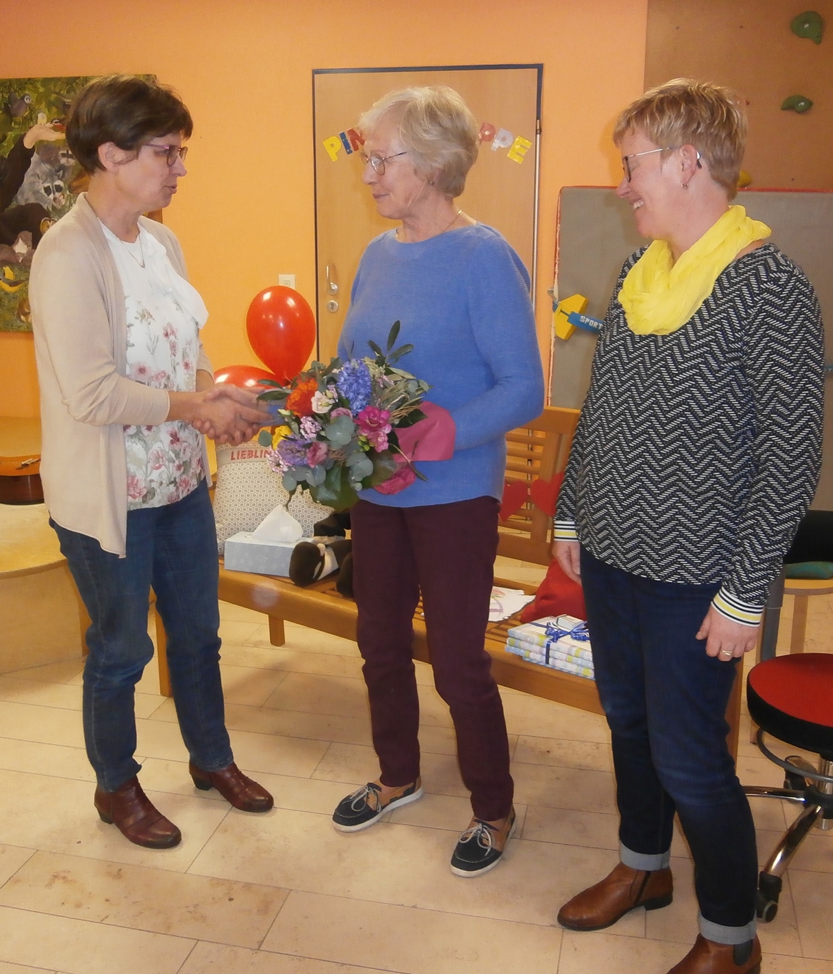 Frau Kaupmann ging als Leiterin schon im August 2018 offiziell in den Ruhestand, sie war aber bereit, der Einrichtung als Vertretungskraft und als Mitarbeiterin bei der Betreuung des Mittagessens weiterhin zur Verfügung zu stehen. Die Kirchengemeinde St. Jakobus d. Ältere, vertreten durch Christine Hölscher (Pfarrbeauftragte) und Marianne Schmalen (Kirchenvorstand) und die Kolleginnen der Kita St. Franziskus möchten sich für diese außergewöhnliche Unterstützung herzlich bedanken! Frau Kaupmann hat dazu beigetragen, personelle Engpässe zu überbrücken. Da sie die Einrichtung gut kannte, brauchte sie keine lange Einarbeitungszeit.