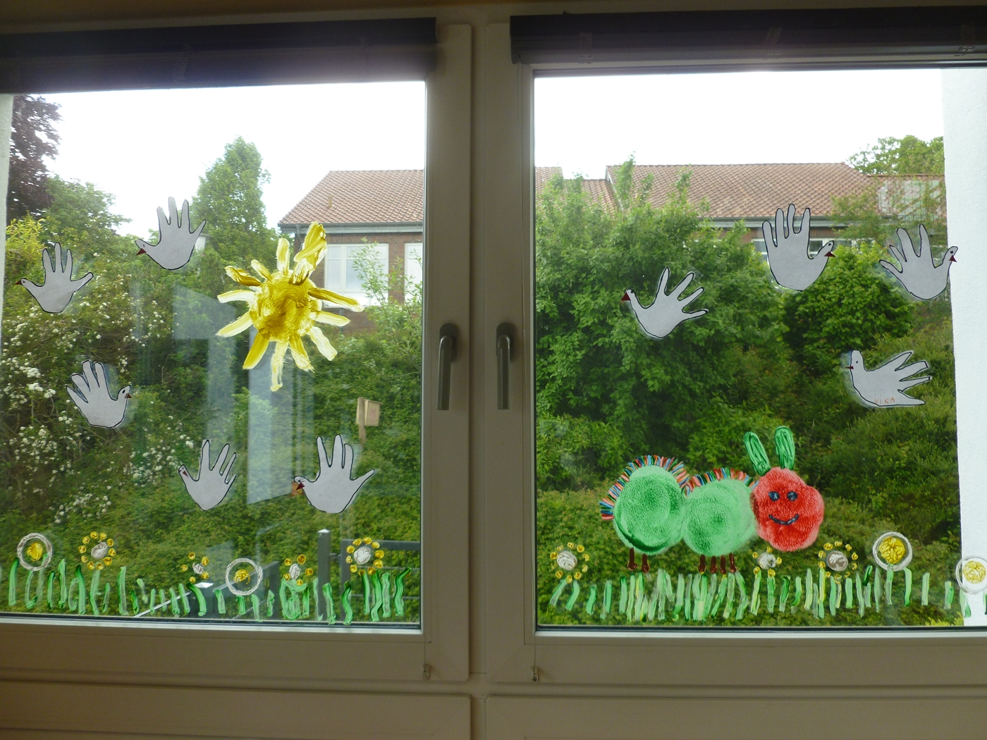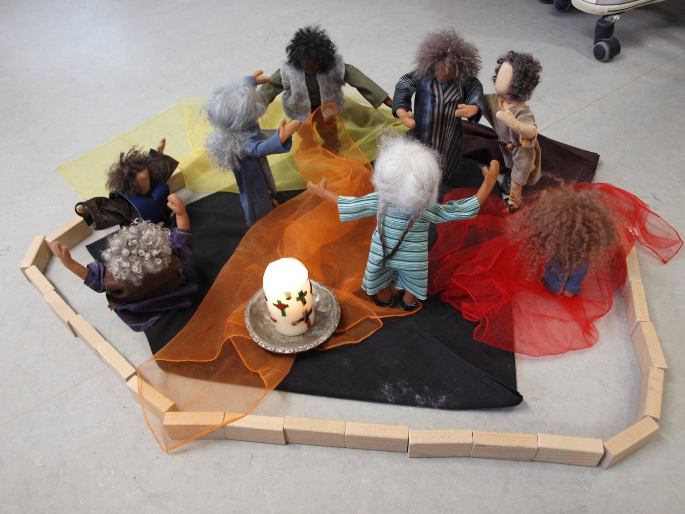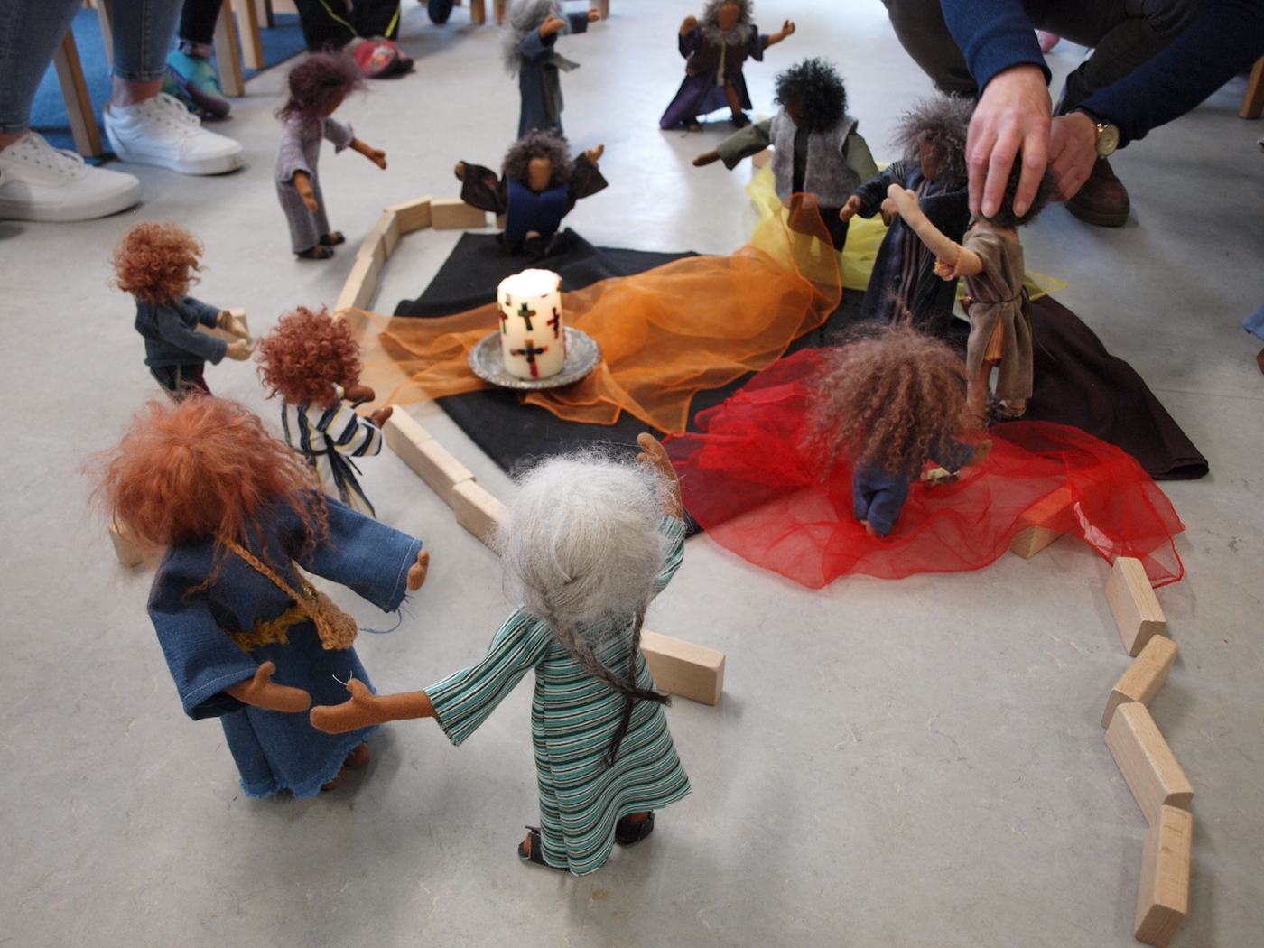 Mit den biblischen Erzählfiguren spielten die Kinder das Pfingstereignis nach. Für den Kindergarten bastelten sie Pfingsttauben, als Zeichen des Friedens und der Versöhnung, die nun die Fenster schmücken. Sie erinnern uns daran: „Gott wenn dein Geist bei uns Menschen ist, kann vieles gut werden!“