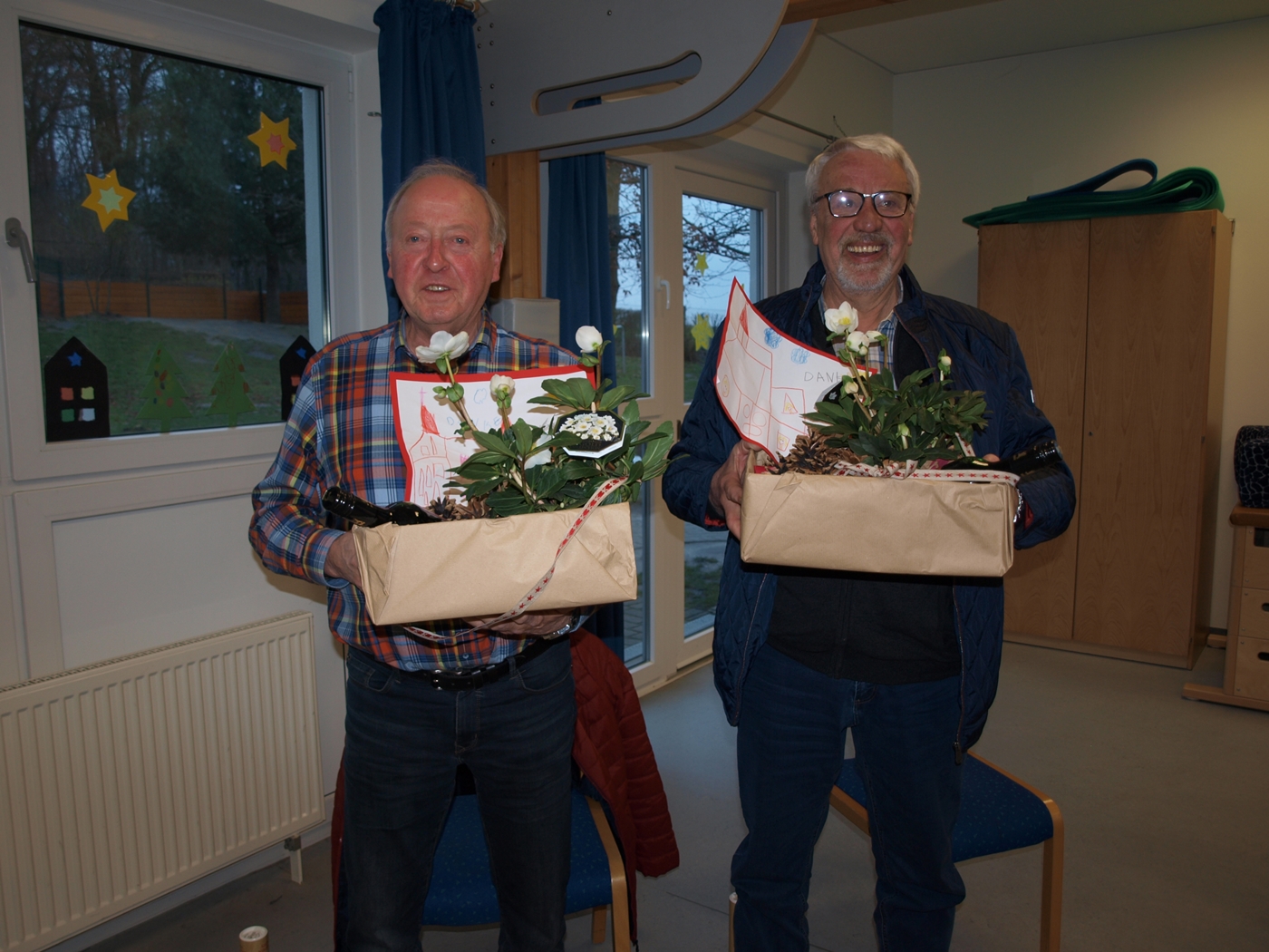In diesem Jahr waren zwei weitere Ehrengäste zur Nikolausfeier eingeladen. Laurenz Licher und Werner Möllenkamp haben sich in den vergangenen sieben Jahren um die Außenanlage und um kleinere Reparaturarbeiten in der Einrichtung gekümmert. Dafür gab es vom Nikolaus Dankesworte. Aber auch alle Großen und Kleinen in der Kita wissen diesen Einsatz zu schätzen und sind dankbar für die verlässliche, gute Arbeit in dieser Zeit.