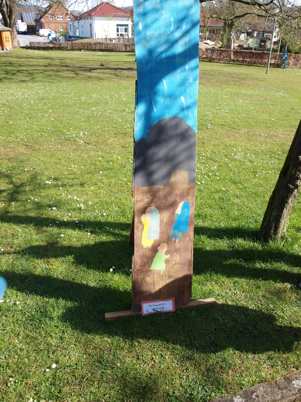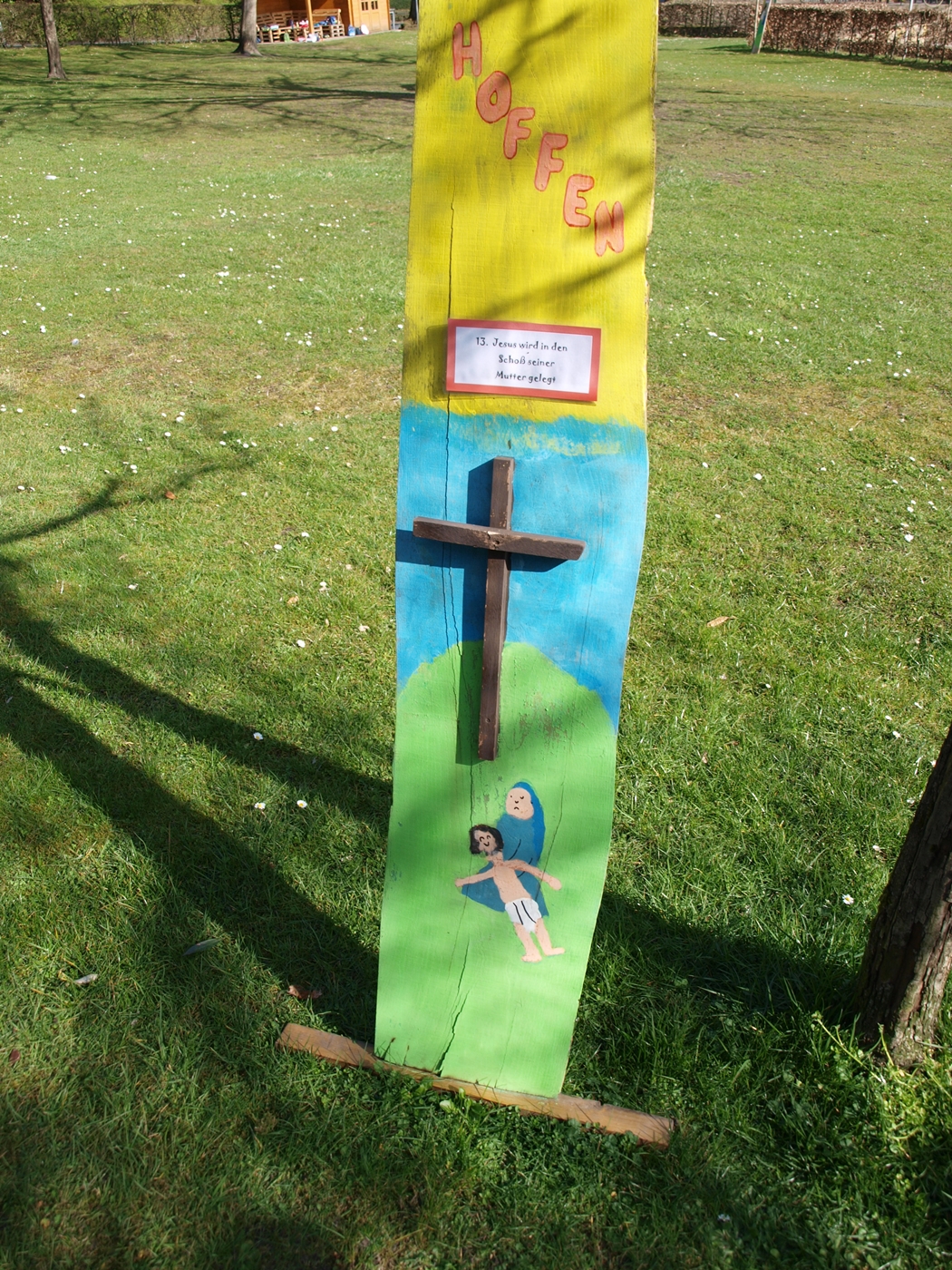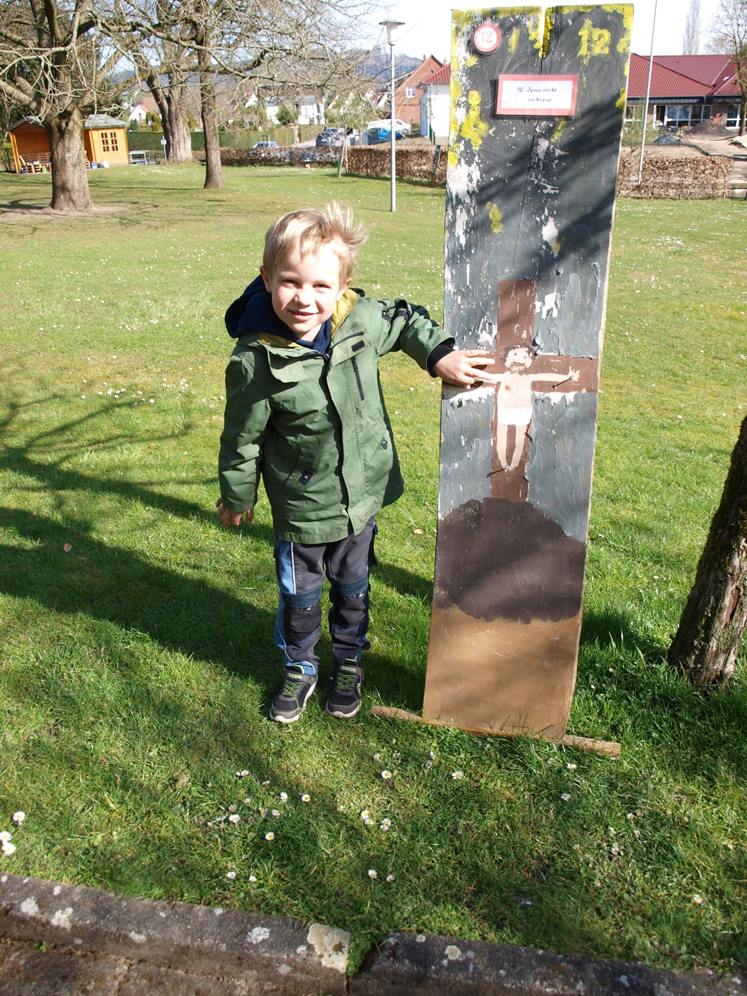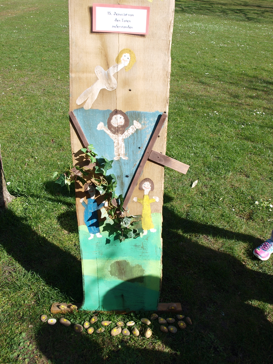 Dort haben wir die Geschichte vom Kreuzweg Jesu auf Bildern, die von Kindergartenkindern gemalt wurden, betrachtet. Wir haben gehört, wie schwer dieser Weg für Jesus war. Wir haben auch gehört, wie Menschen Jesus geholfen haben und bei ihm geblieben sind, bis zu seinem Tod. An der letzten Station hat jedes Kind einen Stein bekommen, zur Erinnerung an den weggerollten Stein und als Zeichen der Osterbotschaft: „Jesus lebt! Er ist auferstanden.“