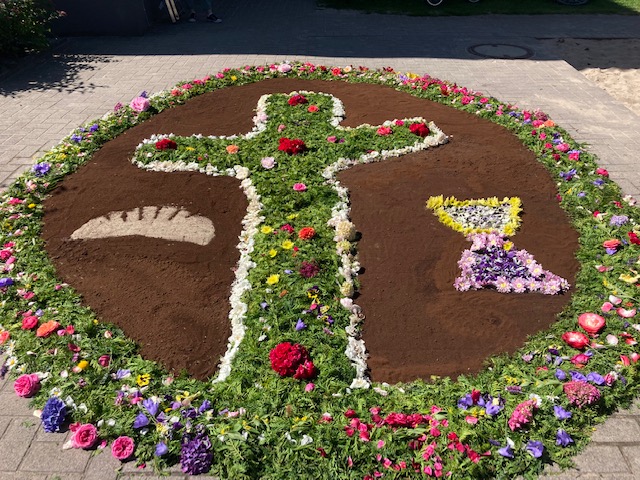 Wie in jedem Jahr legten die Kinder zusammen mit den Erzieherinnen einen wunderschönen Blütenteppich zum Fest Fronleichnam. Hierfür brachten die Kinder Blumen aller Arten mit, welche im Bild ihren Platz fanden.