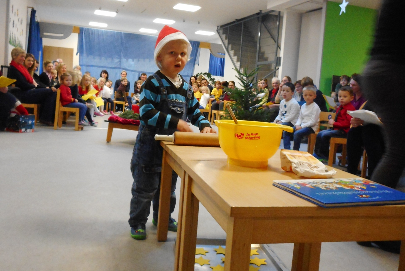 Mit einer roten Wichtelmütze kamen die Zwergenkinder und stellten spielerisch den Teig für die Weihnachtsplätzchen her, was ihnen sehr gut gelang.